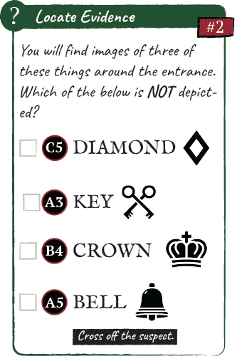 Each clue leads to a multiple-choice question. Every possible answer reveals a coordinate that points to a suspect in the suspects grid.